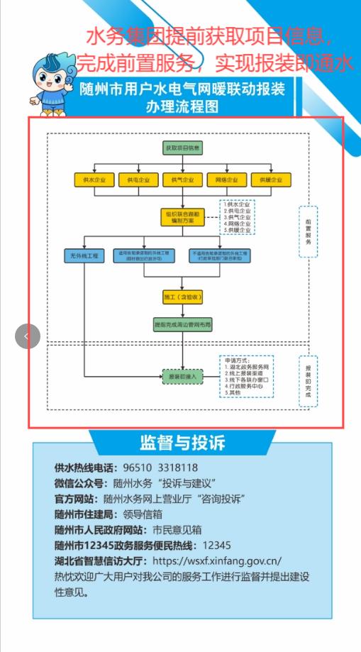 1.“零環(huán)節(jié)”:客戶需要用水時,即時通水; 2.“零跑腿”:安排“客服專員”全程上門服務,無需客戶跑腿; 3.“零資料”:通過湖北省工程建設審批系統、湖北省政務服務平臺獲取項目信息,無需客戶提報資料; 4.“零費用”:針對企業(yè)用戶供水接入項目,工程設計、材料、監(jiān)理、施工全部免費。 |