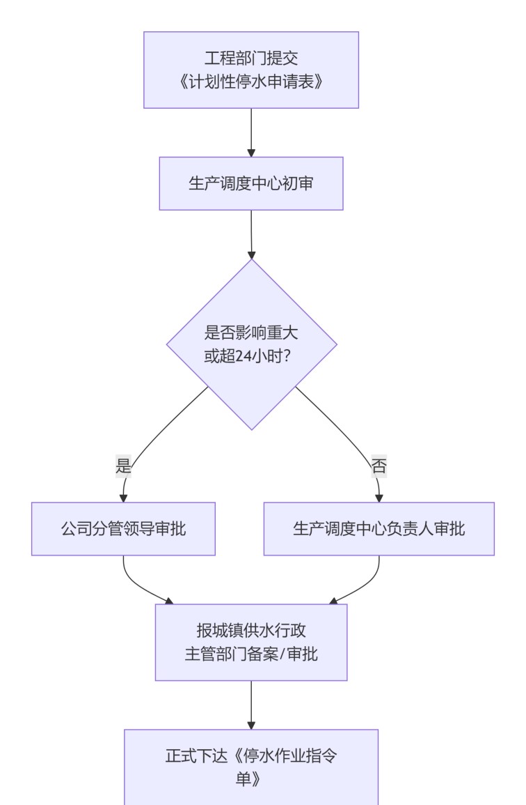 內(nèi)部審批:調(diào)度中心對停水的必要性、時長和范圍進行初審。影響范圍廣或停水時間預計超過24小時的重大作業(yè),需報公司分管領導批準。