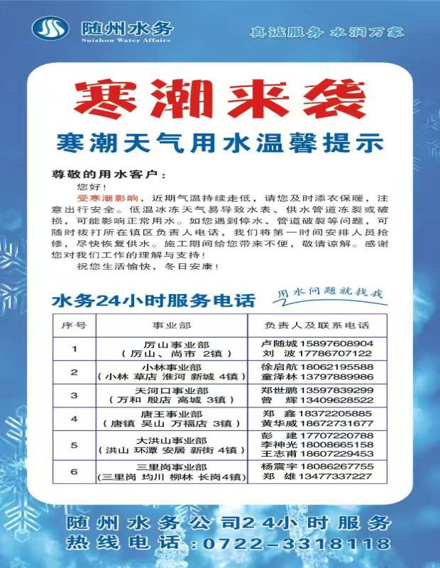 早在寒潮來臨前,公司就已做好周全準(zhǔn)備。提前發(fā)布用水溫馨提示,把24小時服務(wù)熱線和各鎮(zhèn)區(qū)負(fù)責(zé)人聯(lián)系方式廣而告之,通過政務(wù)公開欄、社區(qū)群、微信公眾號等渠道,給15萬市民推送了水管防凍指南,手把手教大家做好自防。同時,工作人員深入鎮(zhèn)村,免費鋪設(shè)2萬多塊保溫棉,給500多公里管網(wǎng)、128處消防栓做了全面防凍包裹,排查整改了4處隱患,從源頭守住了冬季供水的第一道防線。